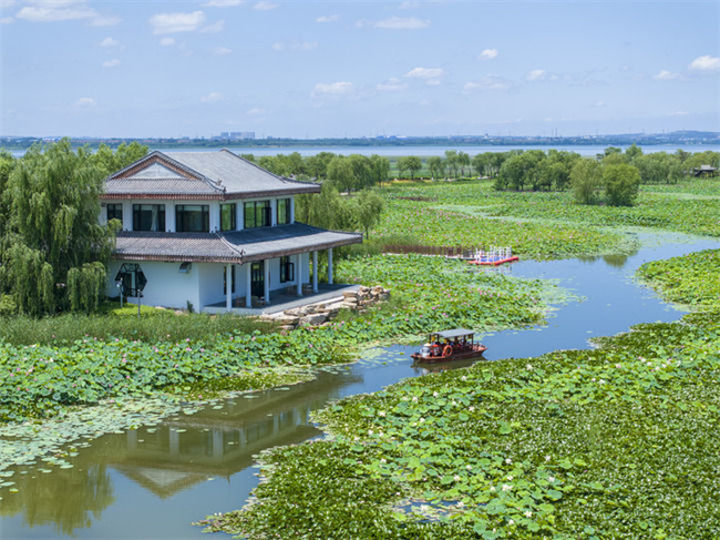 山西省长治市漳泽湖国家城市湿地公园一景(2025年7月5日摄,无人机照片)。新华社发(孙兵兵摄)