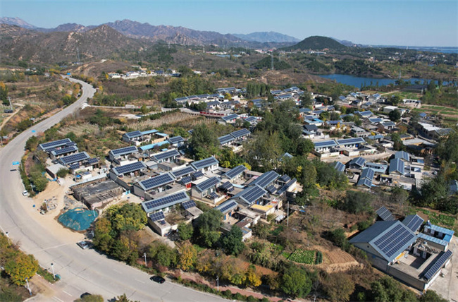 河北省平山县西柏坡镇北庄村兆瓦级“光储”智能微电网示范工程项目中的屋顶光伏发电板(2025年11月2日摄,无人机照片)。新华社记者 杨世尧 摄
