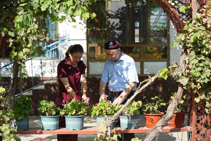 2025年8月30日,买买提江·吾买尔(右)正和女儿打理院里绿植。新华社记者 高晗 摄